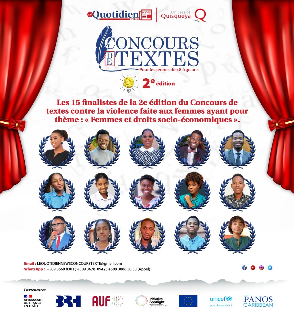 La grande finale de la deuxième édition du Concours de textes organisé par Le Quotidien News se tiendra cette année au Centre de conservation des biens culturels de l’Université Quisqueya, le 3 avril prochain. Dans cet article, on vous présente les quinze participants qui ont été retenus pour cette finale.