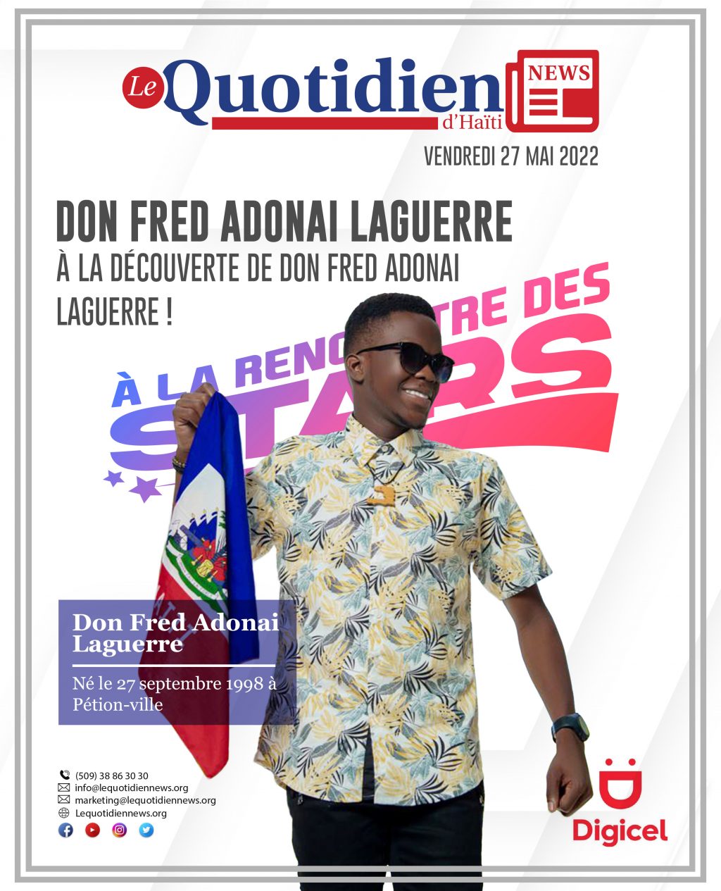 Don Fred Adonai Laguerre est étudiant finissant en Sciences de l’Éducation à l’Université Quisqueya. Né le 27 septembre 1998 à Pétion-Ville, il est volontaire dans plusieurs associations de jeunes et responsable de communication pour la tournée Follow Cantave K. Il est directeur du Campus Hult Prize à l’Université Quisqueya et responsable culturel et social d’un club de lecture Livr’ausore de la Bibliothèque Michèle Tardieu. Il est un artiste et compositeur qui chante dans le style RnB.