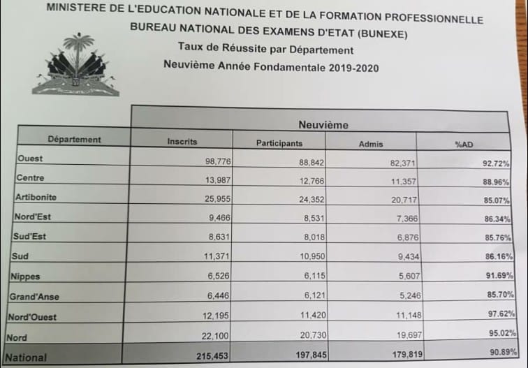C’était une année académique 2019-2020 particulièrement bouleversée en Haïti. Malgré les différents évènements ayant fauché les activités, le bilan en termes de réussite au niveau de la neuvième année ne reflète pas cette fin d’année en catastrophe. Sur une participation de 197,845 candidats,179,819 ont réussis les épreuves. Bilan satisfaisant pour le MENFP.