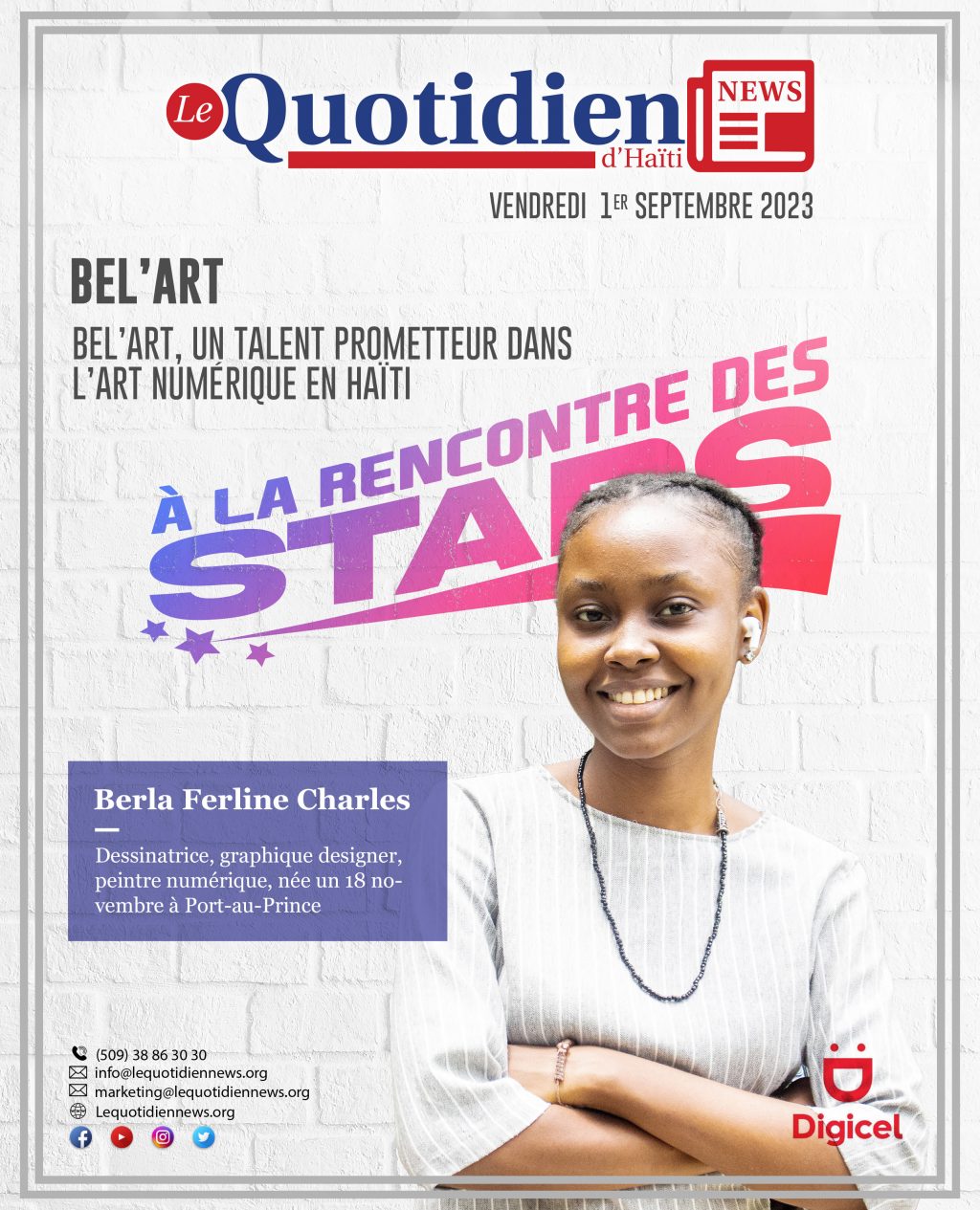 Sur les réseaux sociaux, Berla Ferline Charles, exprime son art dans le langage de la beauté. Dessinatrice pleine de talent, elle affirme se sentir libre dans le processus de la création de ses œuvres. De belles images aux couleurs vives portent en effet la signature de Berl’Art, son nom d’artiste. La graphic designer qui étudie la finance à l’Université Quisqueya, espère remporter des prix internationaux grâce à son talent et encadrer à l’avenir une communauté de jeunes artistes.