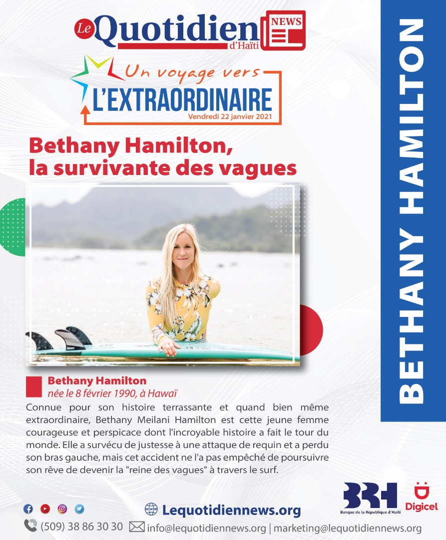 Connue pour son histoire terrassante et quand bien même extraordinaire, Bethany Meilani Hamilton est cette jeune femme courageuse et perspicace dont l’incroyable histoire a fait le tour du monde. Elle a survécu de justesse à une attaque de requin et a perdu son bras gauche, mais cet accident ne l’a pas empêché de poursuivre son rêve de devenir la « reine des vagues » à travers le surf.