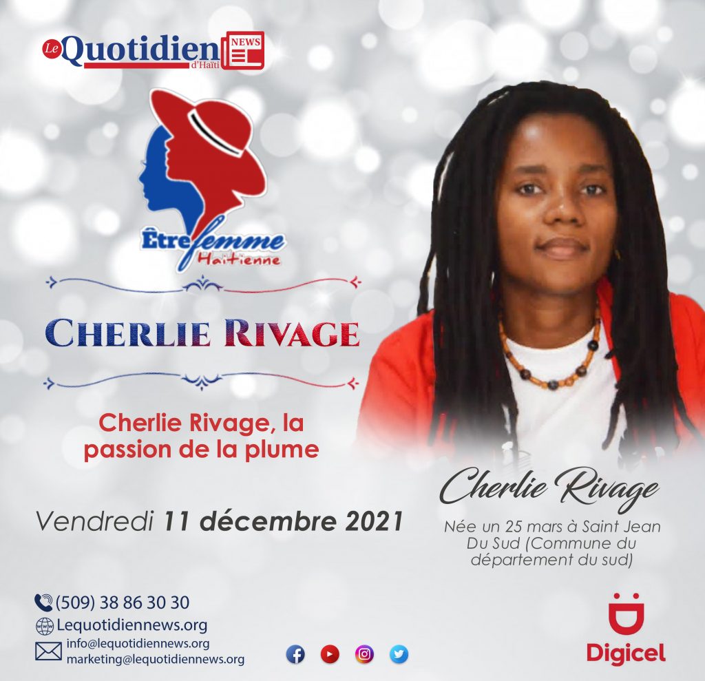 Née un 25 mars à Saint Jean Du Sud (Commune du département du sud), Cherlie Rivage est linguiste, poétesse et opératrice culturelle. Elle fait partie du Comité des femmes écrivaines du Centre Pen Haïti. Elle est aussi membre de l’atelier PLUME (Podium Littéraire Unis pour un Mouvement d’Écriture). En 2015, elle publie son premier recueil de poème intitulé « Mots d’Ailes » aux Éditions des Vagues. L’appréciation étant satisfaite, elle continue de frayer son chemin dans le monde de la poésie. En2019, elle participe au deuxième colloque du Laboratoire LangSÉ avec son article : « L’analogie dans le processus de lexicalisation et de sémantisation en créoles guadeloupéen, guyanais, haïtien et martiniquais », paru aux Éditions Lambert-Lucas.Avec la même motivation, en 2021 elle sort « kadans », son deuxième recueil de poèmes. Un recueil qui porte l’empreinte d’une femme, déambulant dans les rues de Port-au-Prince, à la recherche d’un lieu où dire ses déboires. Un texte paru à la maison d’édition dénomméeFloraison.