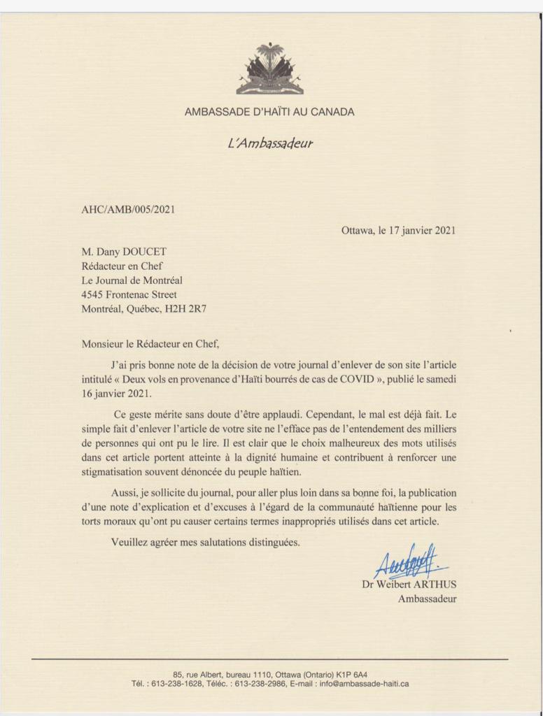 L’ambassadeur extraordinaire et plénipotentiaire d’Haïti, WeibertARTHUS, accrédité au Canada, exige des responsables du journal dénommé Le Journal de Montréal « une note d’explication et d’excuses à l’égard de la communauté haïtienne pour les torts moraux qu’ont pu causer certains termes inappropriés utilisés » dans son article intitulé : « Deux vols en provenance d’Haïti bourrés de cas de COVID », publié en date du 16 janvier 2021 au sein du groupe Quebecor.