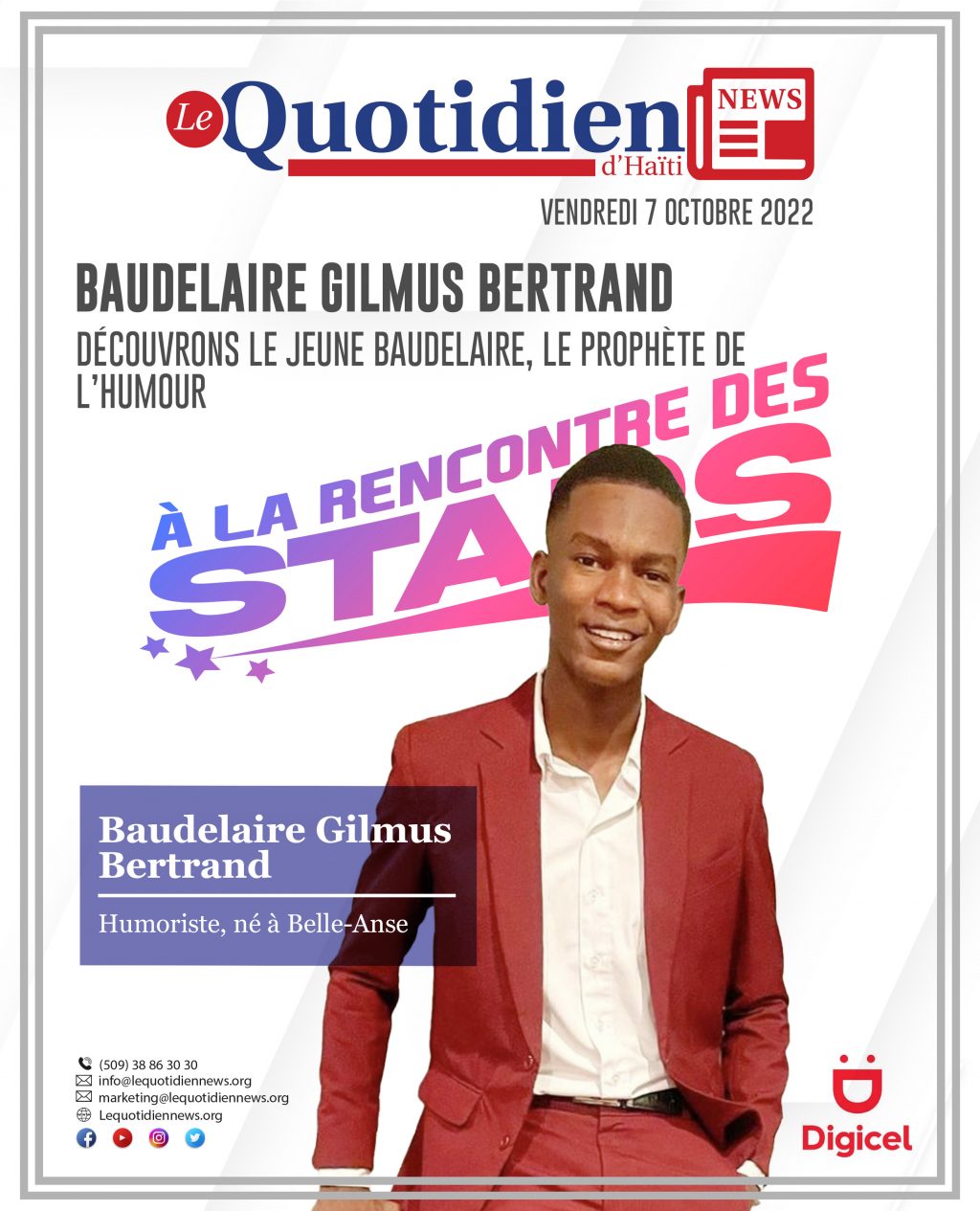 Baudelaire G. Bertrand se fait le prophète du rire sur les réseaux sociaux, en ravivant religieusement l’étincelle de bonheur chez les internautes. Depuis 2019, le natif de Belle-Anse crée la bonne humeur sur la toile avec ses petits sketchs et interprétations comiques. Par le rire, il essaie de mettre  à nu les mœurs de la société, en transmettant des messages positifs.