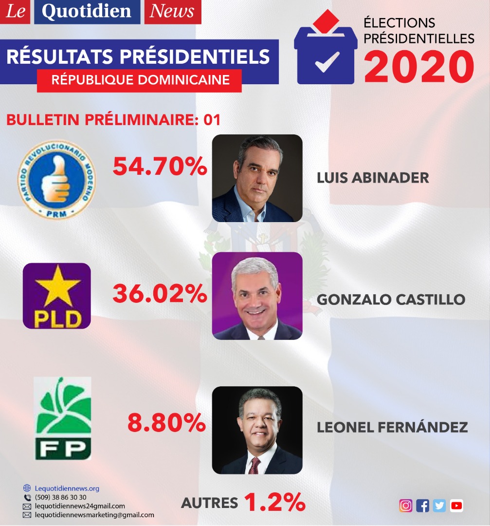 Même réaction de la part de l’ex chef d’État dominicain, Leonel Fernandez qui, selon certaines informations, a obtenu 8% des votes. « Nous félicitons Luis Abinader, candidat du Parti Révolutionnaire Moderne pour avoir été élu président de la république, pour la période 2020-2024, par un vote majoritaire du peuple dominicain », a reconnu celui qui s’apprêtait à revenir au Palais dominicain.