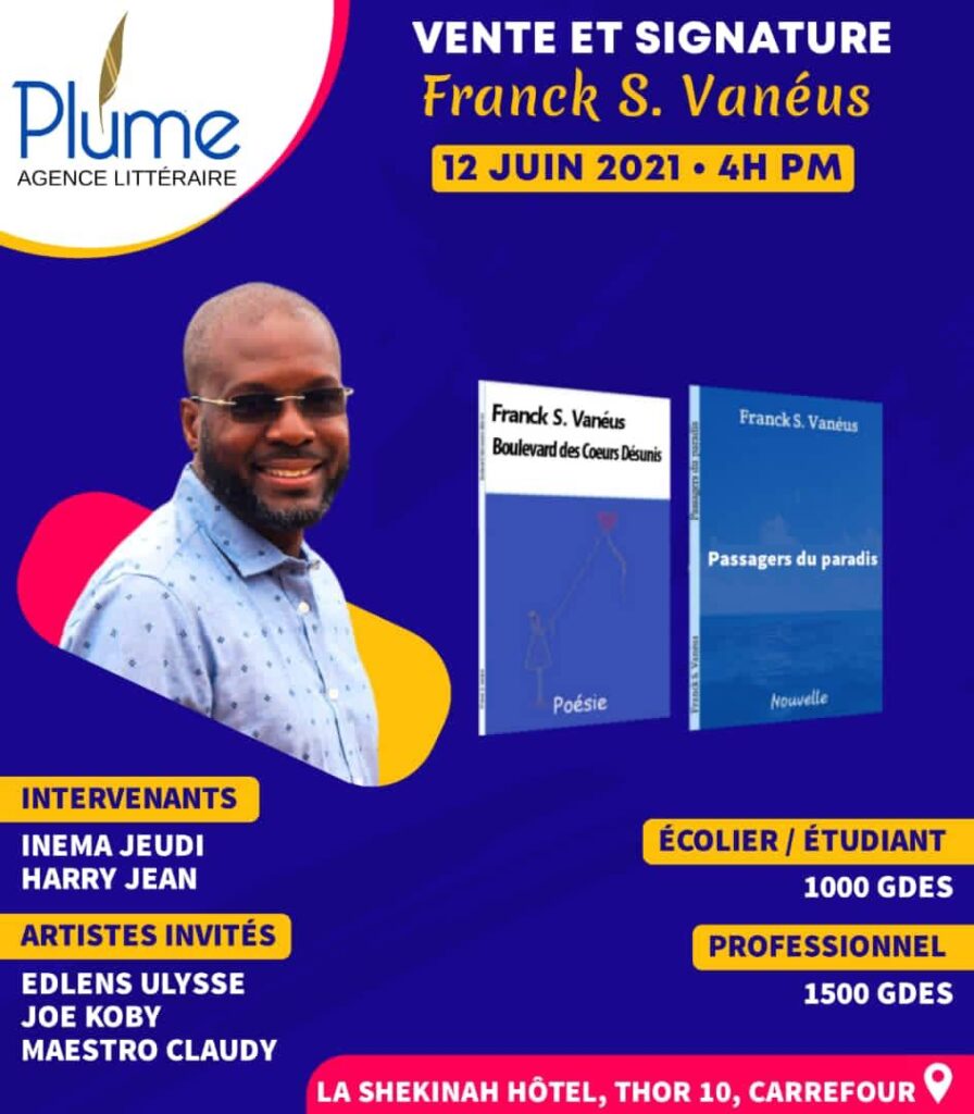 Franck S. Vanéus est avocat depuis plus de vingt (20) et détient un master en philosophie. Il publiera un recueil de nouvelles (Passagers du paradis) et un recueil de poésies (Boulevard des cœurs désunis) le 12 juin 2021 à La Shekinah Hôtel sis au numéro 40, Thor 10, Carrefour.