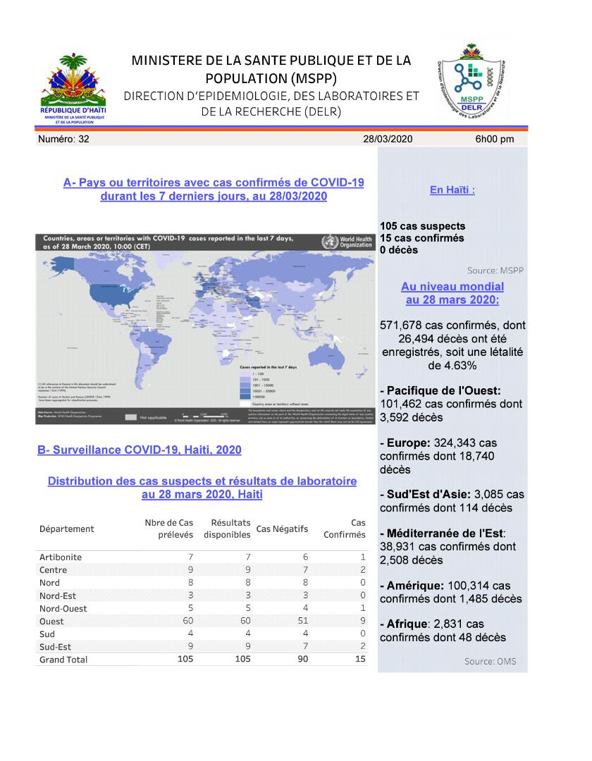 15 cas testés positifs du covid-19 en Haïti , selon les données fournies par la Direction d’Epidémiologie, des Laboratoire et de la Recherche (DELR) publiées par le Ministère de la Santé Publique et de la Population (MSPP), ce samedi 28 mars 2020.