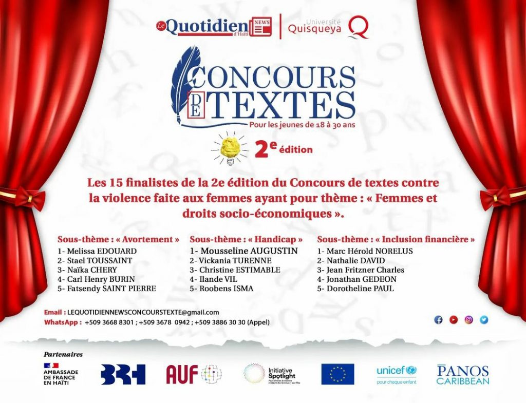 Aujourd’hui, le traitement infligé aux femmes haïtiennes, notamment dans les quartiers populaires, en particulier par les gangs, sont la manifestation d’une barbarie sans nom. La résistance doit s’organiser. Je suis personnellement heureux de l’initiative de ce concours qui a pour but la conscientisation des jeunes sur une question aussi capitale. Je vous souhaite à chacune et à chacun bonne continuation et que la meilleure ou le meilleur gagne ! Rendez-vous le 3 avril prochain !