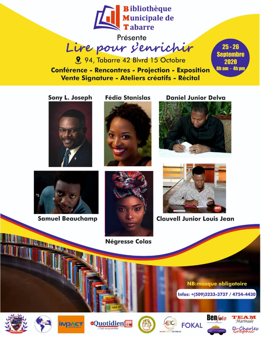 Notons que le lancement de « Lire pour s’enrichir » aura lieu dans la matinée du vendredi 25 septembre à la salle de conférence de la bibliothèque municipale de Tabarre . Après le discours du Directeur, une causerie aura lieu sous le thème de l’événement avec le communicologue Sony Lamarre Joseph, Fédia Stanislas (Prix Deschamps 2020) . Plus loin , plusieurs rencontres auront lieu au cours de cette même journée avec des auteurs majeurs de la littérature haïtienne contemporaine.