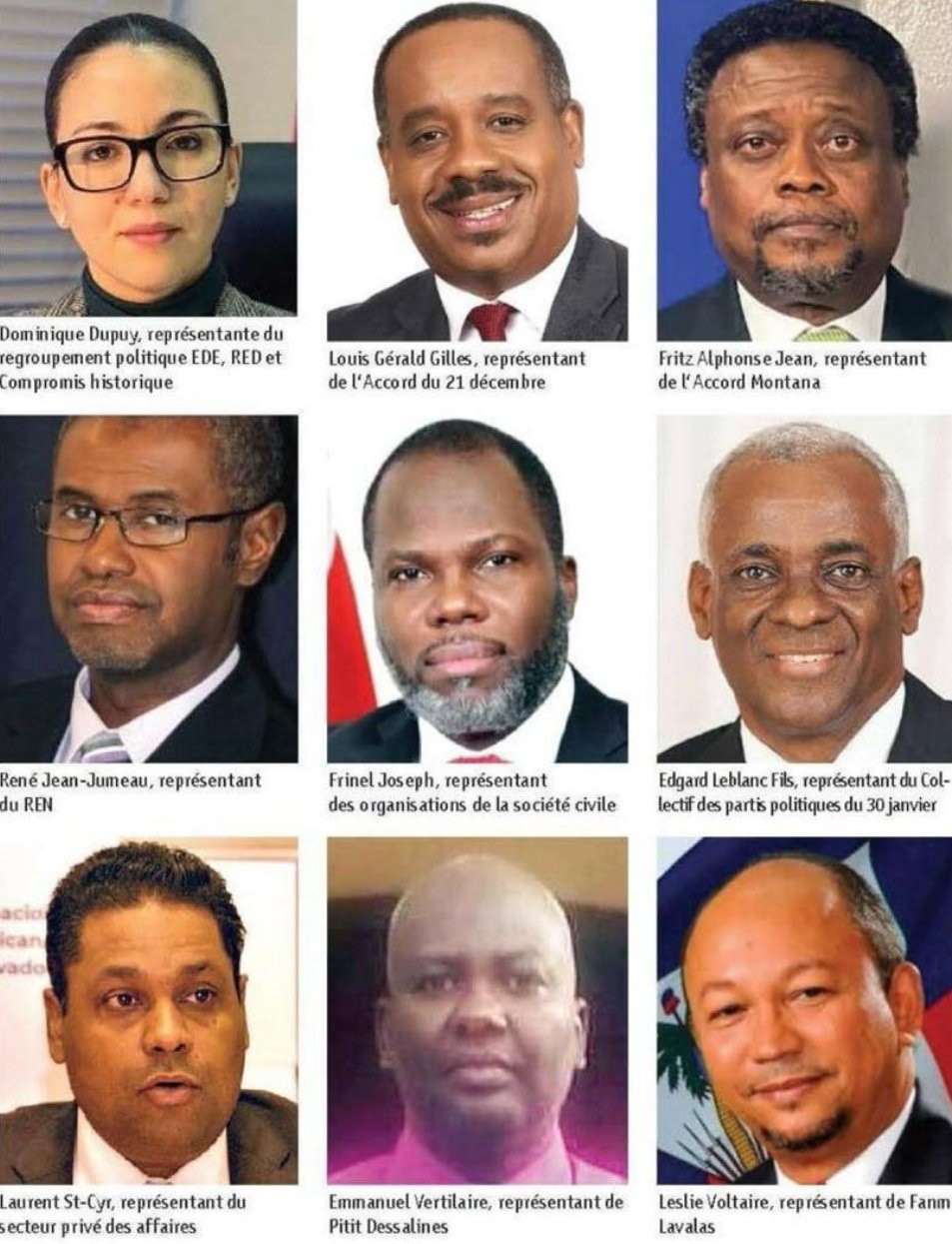 Il est à rappeler que toutes les structures ont déjà transmis le nom de leur représentant à la CARICOM. À cet effet, les noms suivants feront partie du Conseil devant siéger à la tête du pays : Pitit Dessalines, Emmanuel VERTILAIRE ; RED/ EDE/Compromis historique, Dominique DUPUY ; Laurent ST-CYR, Secteur Privé ; Lesly VOLTAIRE, LAVALAS ; Louis Gérald GILLES, Accord du 21 décembre ; Edgard LEBLANC FILS, Collectif 30 janvier ; Fritz Alphonse JEAN, Accord Montana ; René Jean JUMEAU, REN; Frinel Joseph, société civile.
