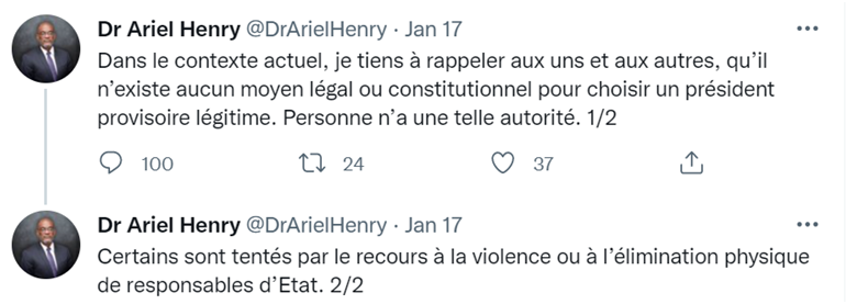 D’un point de vue juridique, les experts haïtiens conviennent qu’il n’y a aucune disposition dans la Constitution et dans les lois haïtiennes qui traitent de la façon de remédier à ce vide présidentiel dans le contexte où il s’est produit. L’actuel Premier Ministre, le Dr Ariel Henry, a écrit dans un tweet: