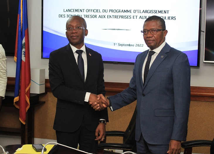 Un protocole d’accord a été signé entre le Ministère de l’Économie et des Finances (MEF) et la Banque de la République d’Haïti (BRH) sur l’élargissement de l’attribution des bons du trésor aux entreprises et aux particuliers ce jeudi 1er septembre dans les locaux du MEF. Réservés jusqu’à présent uniquement aux institutions financières depuis 1995, selon le Gouverneur de la BRH,  Jean Baden DUBOIS, cette mesure constitue un bon pas vers la création d’un marché financier et de capitaux en Haïti.
