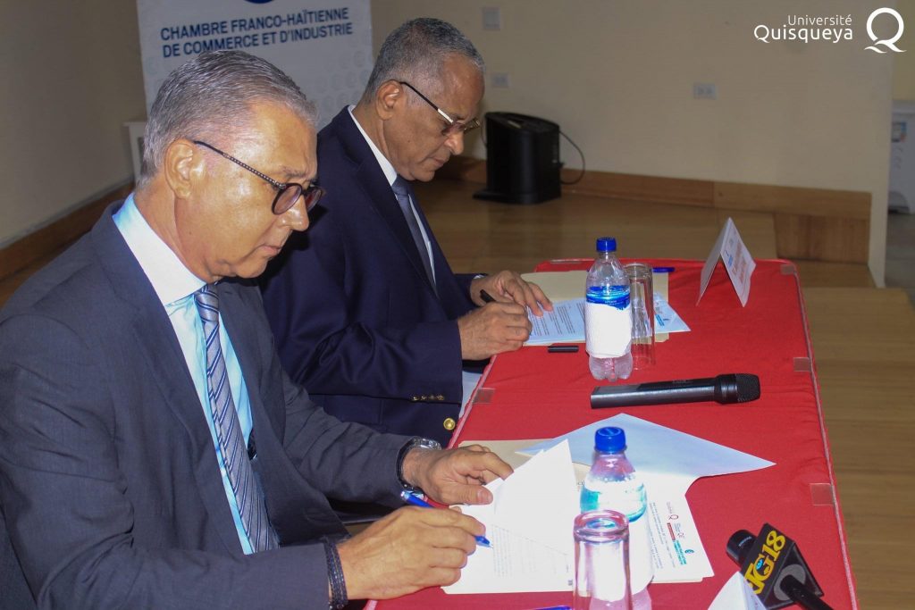 Ce mercredi 6 juillet 2022, l’Université Quisqueya à travers son Incubateur et la Chambre Franco-Haïtienne de Commerce et d’Industrie sont parvenus à un accord de partenariat qui aura pris pas moins de 6 mois de négociation. Jacky Lumarque, Recteur de l’Université Quisqueya et le Président de la Chambre Franco-Haïtienne, Grégory Brandt, ainsi que Benito CLERMONT, Responsable de l’Incubateur-QE3 sont intervenus pour informer sur l’objectif et la nécessité de cet accord.