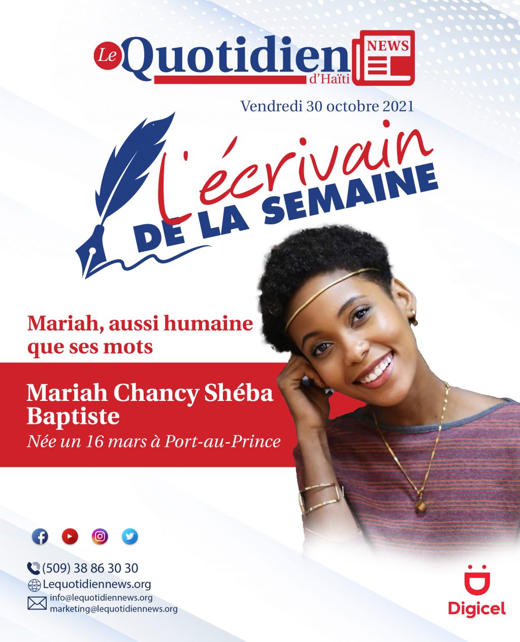 Mariah Chancy Shéba Baptiste est née un 16 mars à Port-au-Prince. Elle a fait ses études au Collège Marie-Anne. Elle prépare actuellement une licence en sciences politiques et philosophiques à l’IERAH/ISERSS de l’Université d’Etat d’Haïti, spécialisation genre et théories politiques. Elle fait partie du comité des femmes écrivains du centre PEN dont elle est aussi membre. Elle est poète, écrivain, nouvelliste et elle s’exerce à la Maison des écrivains. Elle a été redactrice au Nouvelliste et au journal le National. Elle est enseignante au Collège Marie-Anne où elle travaille avec des enfants. Son amour pour l’humain l’a poussé à travailler depuis des années avec eux afin de mieux les préparer pour affronter l’avenir.