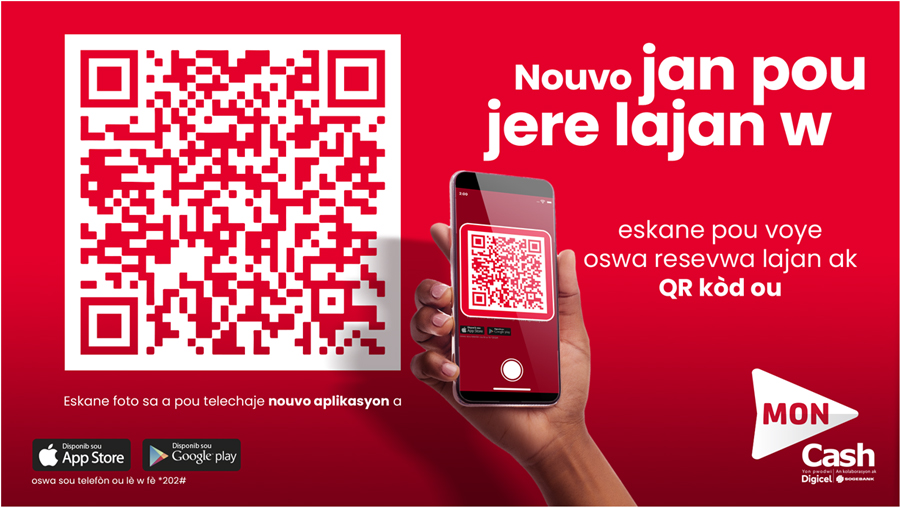 La nouvelle application MonCash offre un code QR personnalisé qui intègre le numéro de téléphone de l’utilisateur, permettant ainsi des transactions plus rapides. Les utilisateurs pourront faire des paiements en scannant le QR des autres utilisateurs ou recevoir des paiements en offrant leur code QR. La nouvelle fonctionnalité du code QR se trouve sous « Mon code QR » dans l’application MonCash.