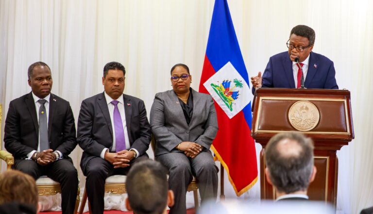 Le nouveau coordonnateur du Conseil Présidentiel de Transition (CPT), Fritz Alphonse Jean, lors de son discours à la cérémonie de...