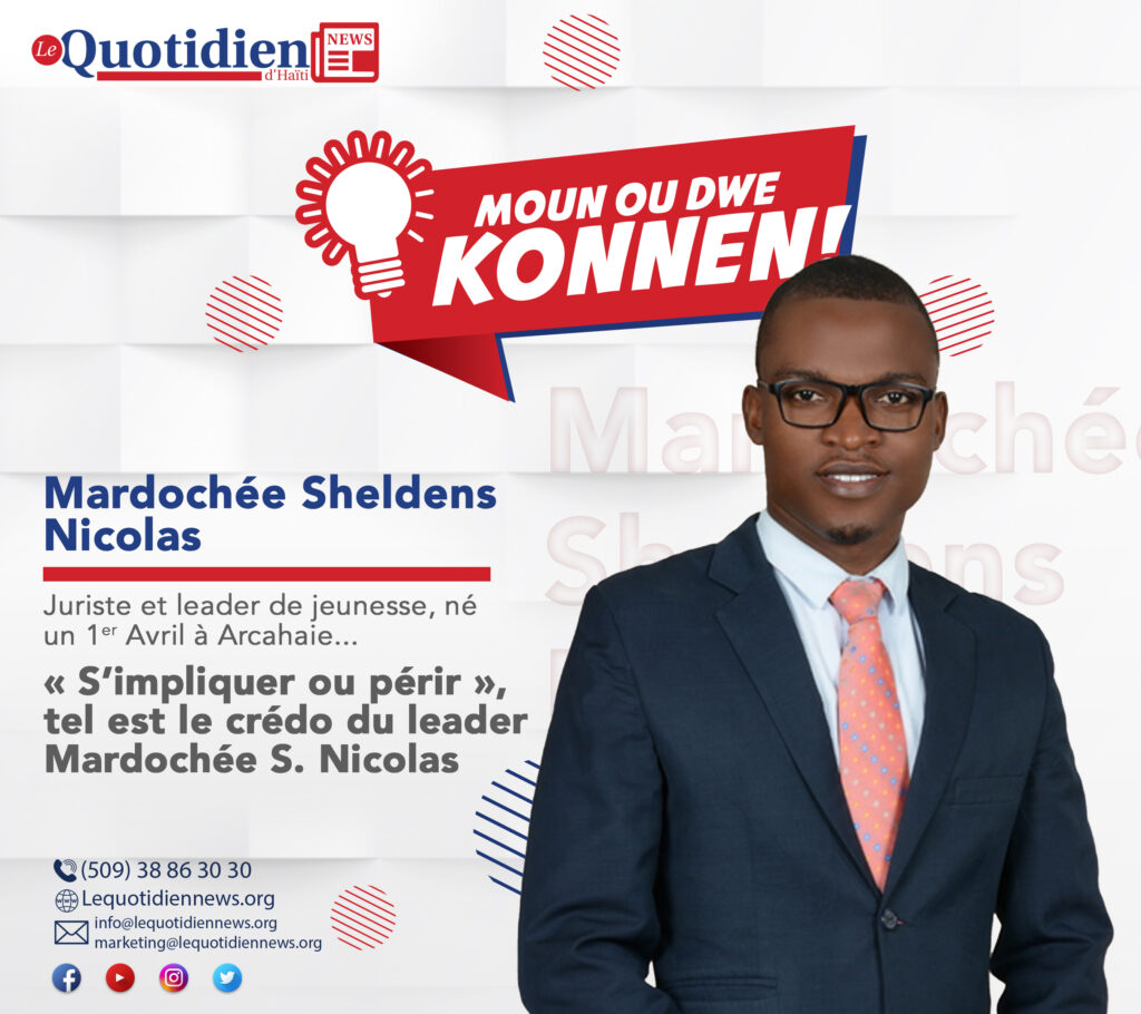 Mardochée Sheldens Nicolas, juriste de formation, est un jeune leader haïtien qui prône le changement par le leadership et l’entrepreneuriat. « S’impliquer ou périr » est sa devise, il invite la jeunesse à prendre leur son avenir en mains.