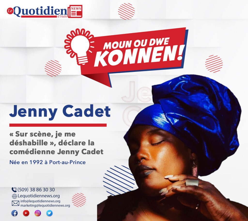 Jenny Cadet est une jeune comédienne haïtienne d’une trentaine d’années qui prend son pied sur scène en incarnant un personnage qu’elle rend fascinant. Si le personnage la possède dans son rôle, elle en profite par ailleurs pour goûter à une expérience incommensurable avec sa personne, car, dit-elle, elle se sent elle-même sur scène. « Il est vrai que je prête mon corps au personnage que j’interprète, mais au fond de moi je me sens moi-même sur scène », confie avec beaucoup d’enthousiasme la comédienne.