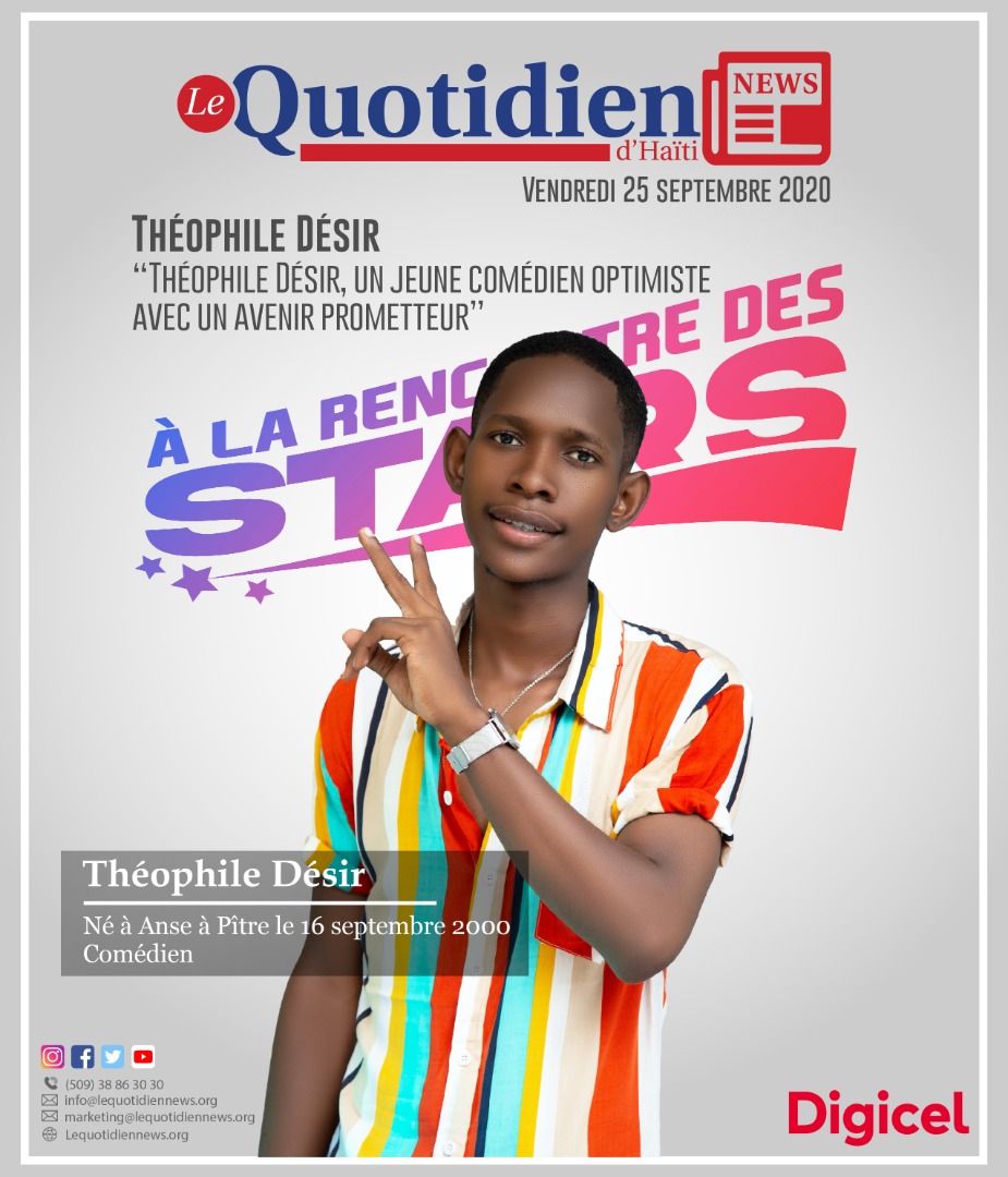 Théophile Désir, jeune comédien et beatmaker, est un petit fils d’Anse à Pitre situé au Département du Sud-est. Le 16 septembre dernier, il a festoyé son 20ème anniversaire de naissance. Une belle âme de l’an 2000 ! Ce jeune talent navigue sa passion sur les vagues de la musique et du théâtre, il espère conquérir le monde du cinéma en devenant un modèle emblématique tant en Haïti qu’à l’échelle internationale.
