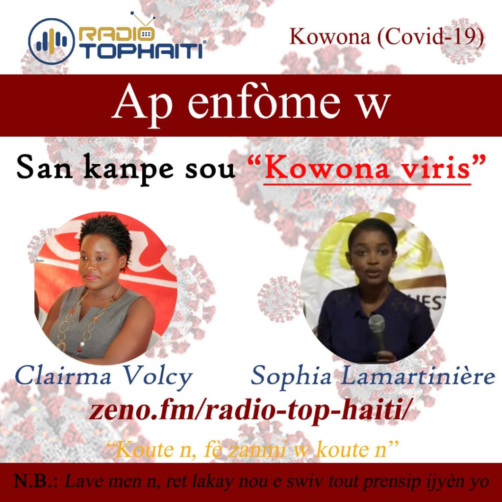 « Top News », récemment intégré dans la programmation de la radio en ligne « Top Haïti », est une édition biquotidienne spéciale de nouvelles sur le Coronavirus. Présentée chaque 12h et 18h respectivement par Sophia LAMARTINIÈRE et Clairma VOLCY sur la radio « Top Haïti » qui émet sur la plateforme Zeno Radio et les Réseaux Sociaux de TOP HAITI, ces bulletins visent à informer la population haïtienne de l’évolution de cette pandémie tant à l’échelle nationale qu’internationale.