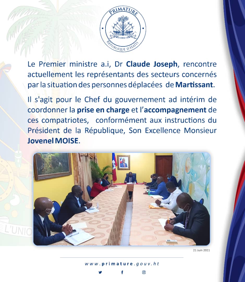 C’est suite à ces instructions que le premier ministre ad intérim Claude Joseph a rencontré, le 21 juin 2021, les concernés autour de la situation des personnes ayant dû fuir Martissant. Cette rencontre aurait tourné autour de la prise en charge et de l’accompagnement de ces déplacés un peu partout à travers Port-au-Prince dont la place de Fontamara et le centre sportif de Carrefour.
